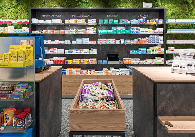 Die besondere Lage – ohne angrenzende Ärzte, aber mit hoher Laufkundschaft und sehr guten Parkmöglichkeiten – machte ein visuell starkes Konzept notwendig, das Aufmerksamkeit erzeugt und gleichzeitig Vertrauen bildet. Gütler entwickelte daher ein offenes, klar strukturiertes Apothekenlayout mit loftartigem Charakter, das durch Materialien, Farben und Lichtführung eine moderne, einladende Atmosphäre schafft.