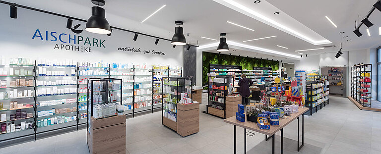 Die Aischpark Apotheke entstand als komplette Neugründung in einem Einkaufscenter und verbindet moderne Apothekentechnik mit einem offenen, loftartigen Gestaltungskonzept. Auf dieser Basis entwickelte Gütler ein markantes Raumgefühl, das besonders junge Kunden anspricht und gleichzeitig funktionale Abläufe optimal unterstützt.