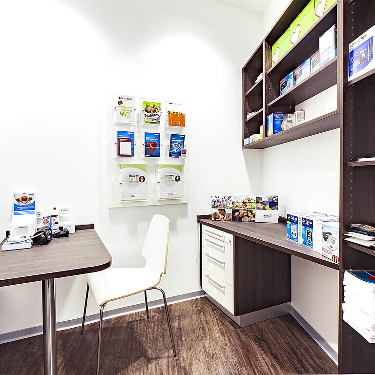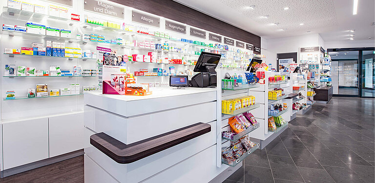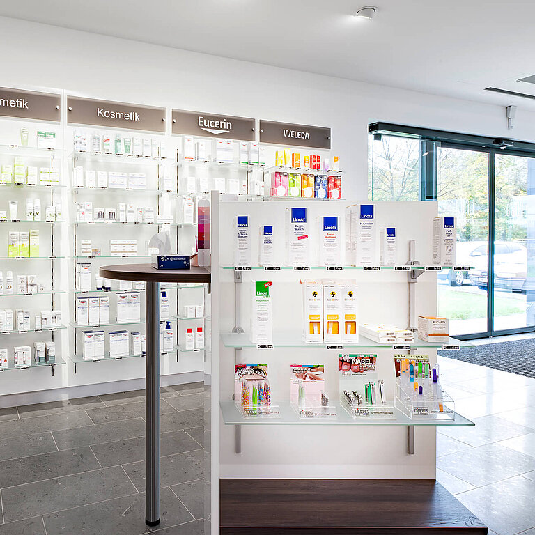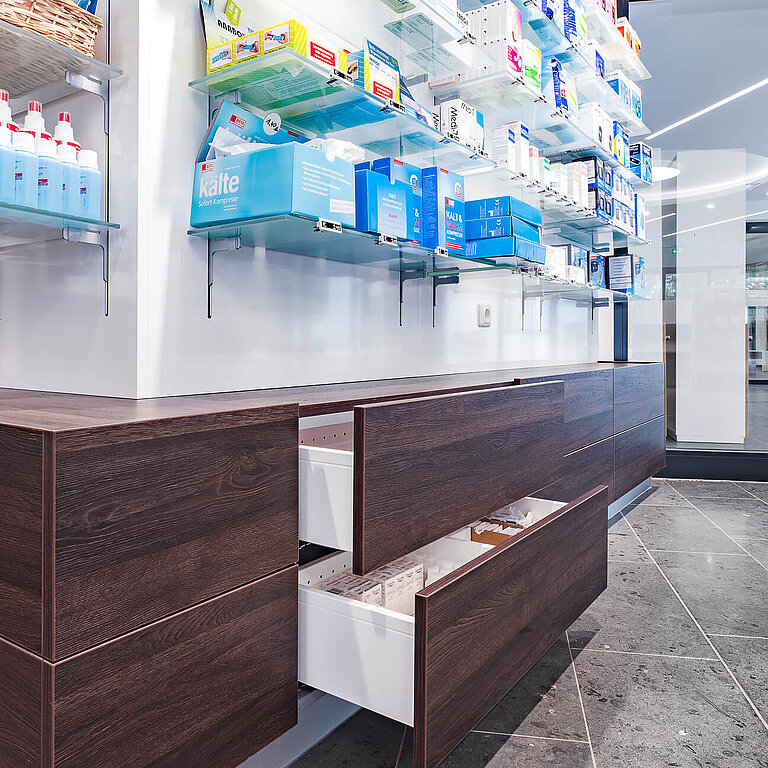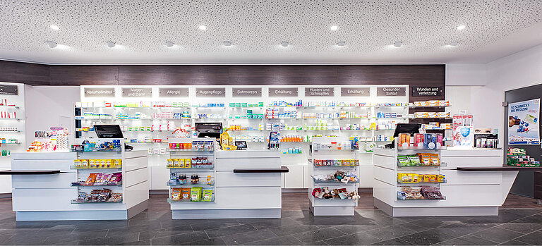 Eine besondere planerische Herausforderung lag in den drei Kundeneingängen: Alle Besucher sollten unabhängig vom Eingang intuitiv zu den Verkaufstischen geführt werden. Durch eine gezielte Wegeführung, abgestimmte Möblierung und kluge Zonierung entstand eine Apotheke, die Kunden Orientierung bietet und den Mitarbeitenden effiziente Prozesse ermöglicht. Die Umsetzung zeigt, wie Gütler aus Freiflächen funktionale, wirtschaftlich durchdachte Apothekenkonzepte entwickelt – und gleichzeitig die Grundlage für langfristige Marken- und Standortstärke schafft.