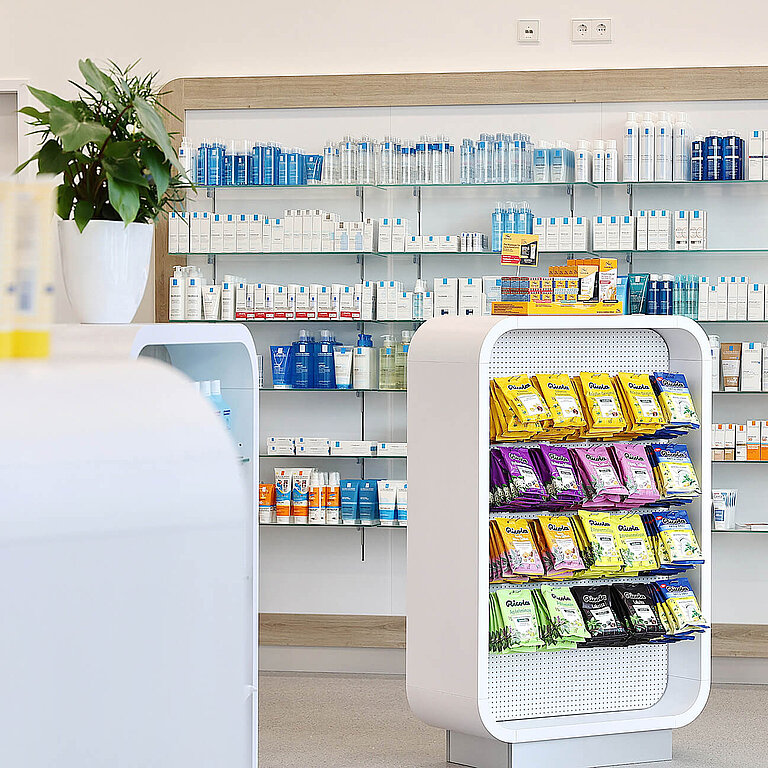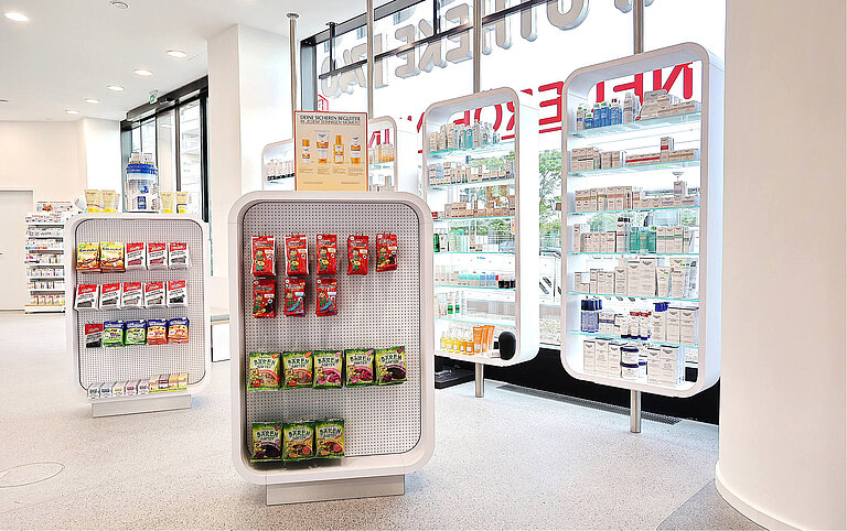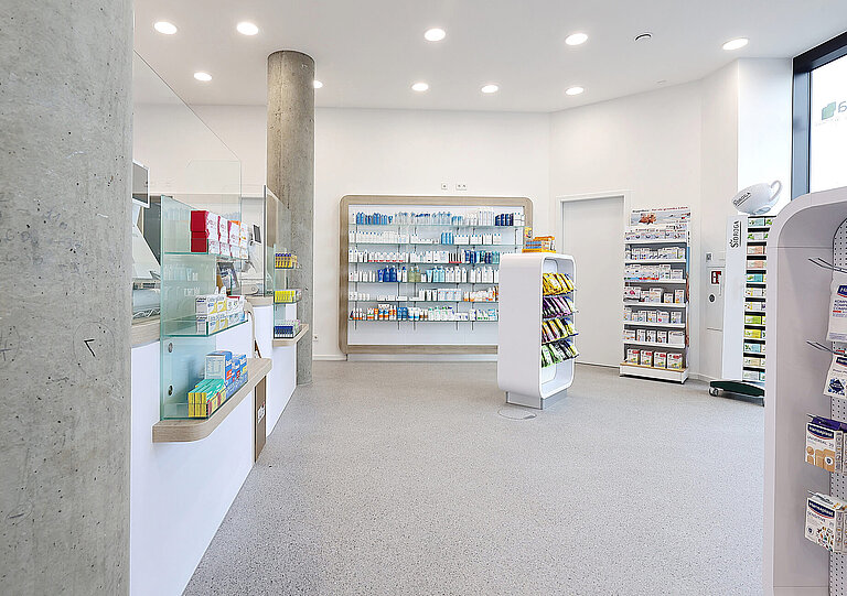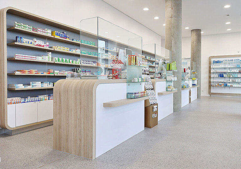Die Apotheke im RKM 740 entstand im Erdgeschoss eines modernen Wohn- und Gewerbekomplexes und verbindet architektonische Besonderheiten des Gebäudes mit einer funktionalen, klar strukturierten Raumlösung. Gütler setzte die Planung des externen Architekten präzise um und schuf eine Apotheke, die Kunden wie Mitarbeitende gleichermaßen überzeugt.