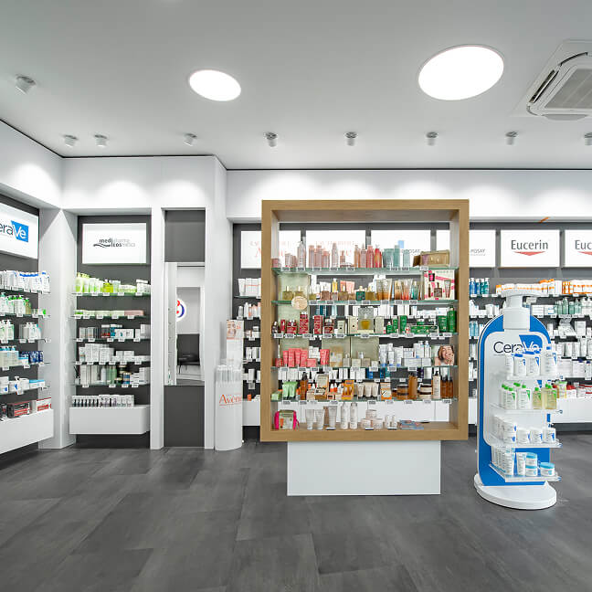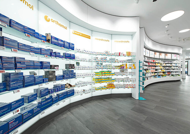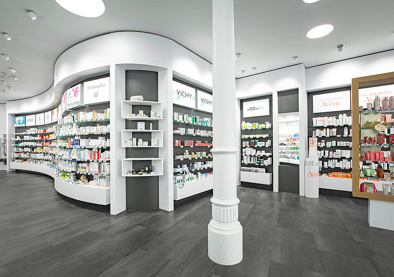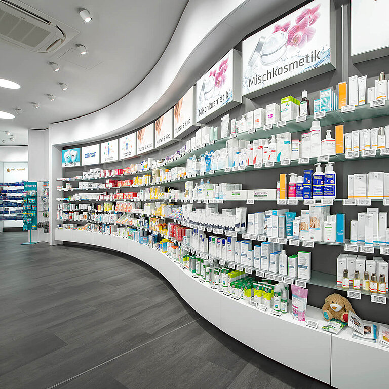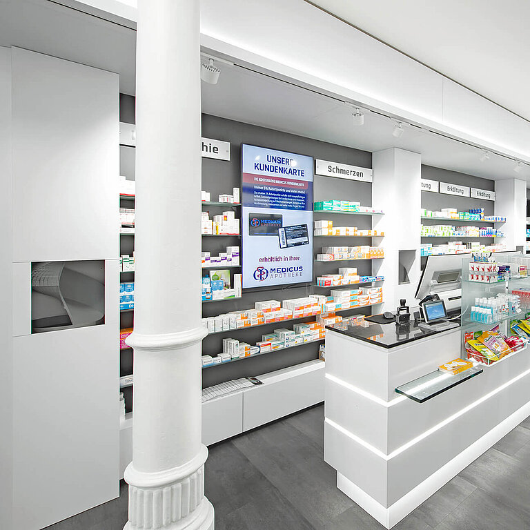Die Medicus Apotheke wurde in eine verwinkelte Altbaufläche integriert. Gütler entwickelte eine Planung, die die komplexen Raumkonturen aufnimmt und gleichzeitig eine klare Wegeführung, gleichmäßig zugängliche Handverkaufstische und effiziente Abläufe ermöglicht – trotz herausfordernder baulicher Voraussetzungen.