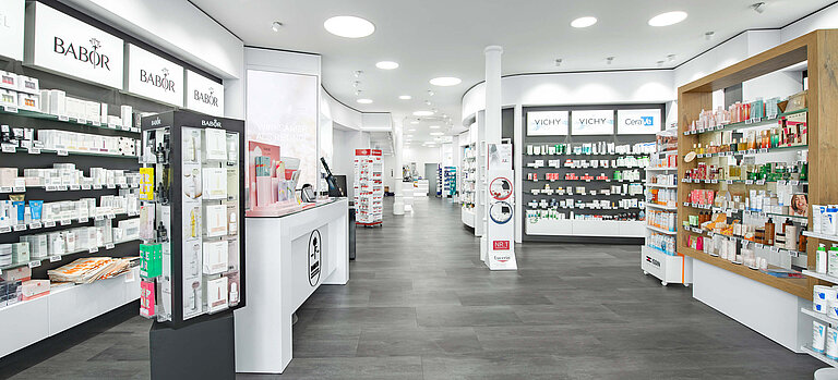Die besondere Herausforderung lag in der komplizierten Raumstruktur des Altbaus. Die unregelmäßigen Konturen mussten in die Offizin übernommen werden, ohne die Orientierung für Kund:innen zu beeinträchtigen. Durch eine präzise Wegeführung bleibt der Zugang zu den HV-Tischen klar erkennbar und gleichmäßig verteilt.