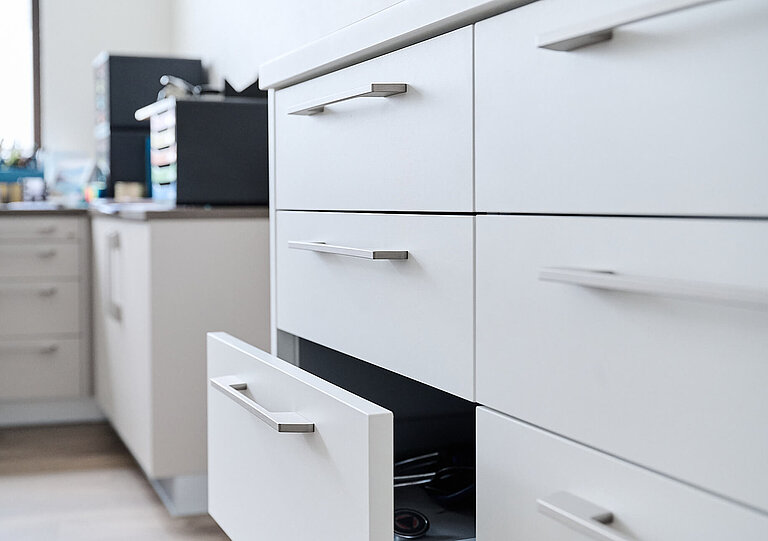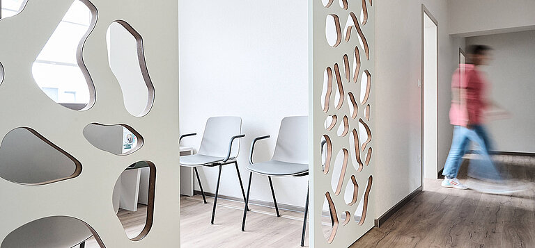 Die Umsetzung erfolgte zügig innerhalb von vier Monaten und in enger Abstimmung mit der Versicherung. Gestalterisch prägend ist der offene Wartebereich: Er liegt ausreichend entfernt vom Empfang und entlang der Wege zu den Sprechzimmern, sodass eine einladende, transparente Atmosphäre entsteht – ohne Konflikte mit dem Datenschutz.