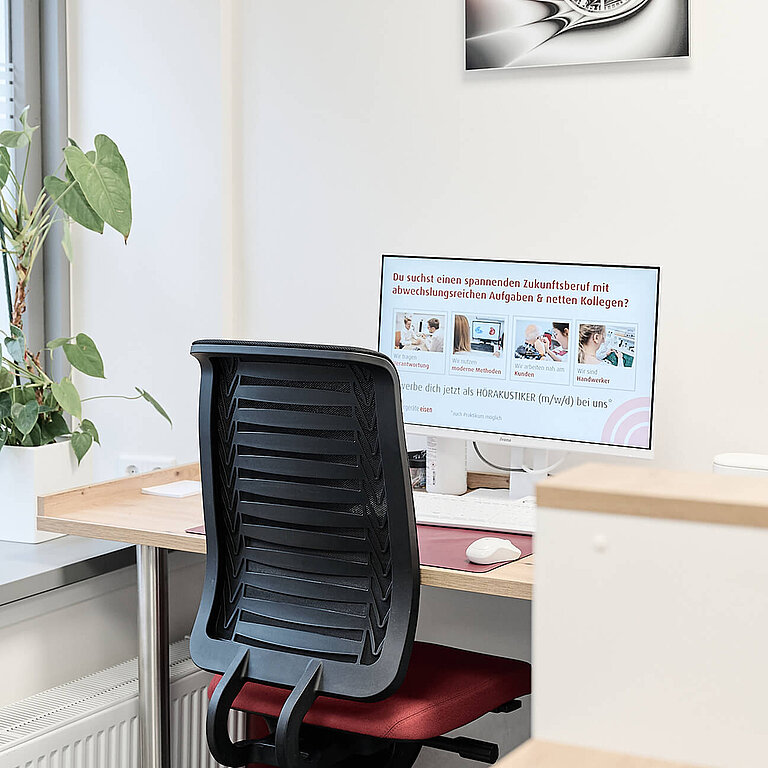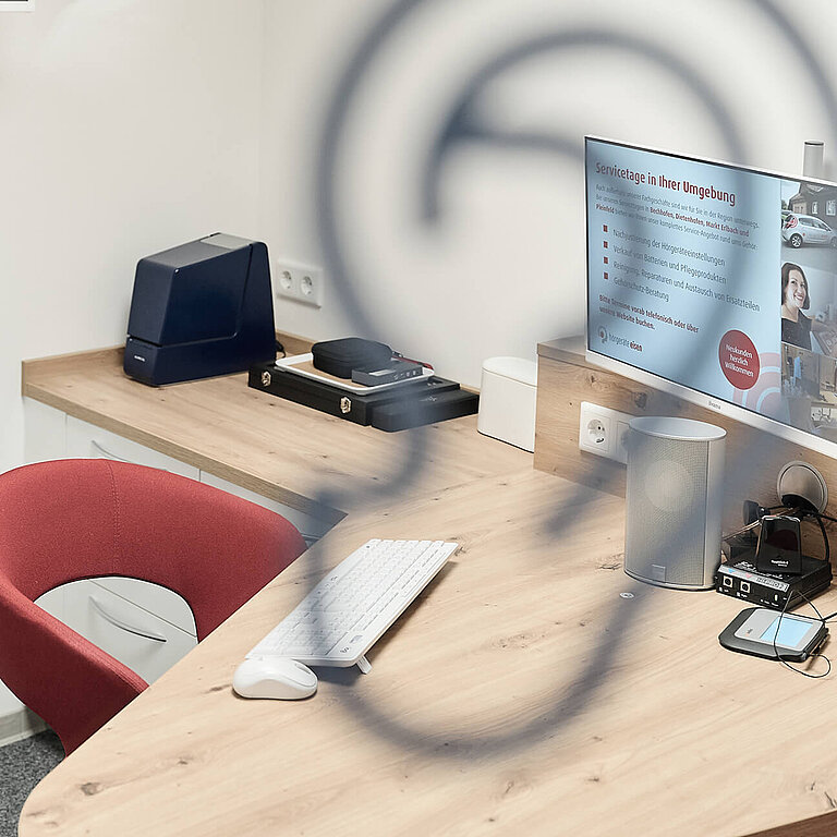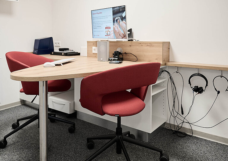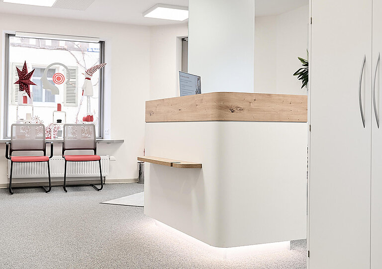 Die Designlinie der gesamten Hörgeräte‑Eisen‑Filialwelt wurde konsequent fortgeführt, sodass auch Wartebereich und Personalräume ein einheitliches Markenerlebnis bieten.