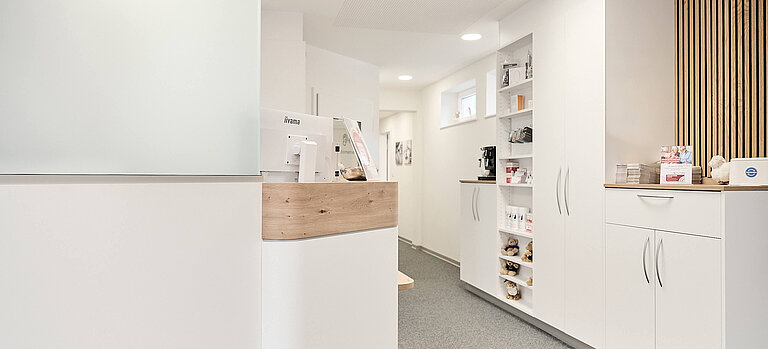 In der komplexen Altbaugeometrie entstanden durch neue Decken, neu gesetzte Wände und klar definierte Raumfunktionen moderne Anpassräume, Werkstattbereiche, Büroflächen sowie ein optimal organisierter Empfangsbereich. Dieser wurde so gestaltet, dass er zugleich Arbeitsplatz, Kassenfunktion und sichtbarer Anlaufpunkt für die Kunden ist.